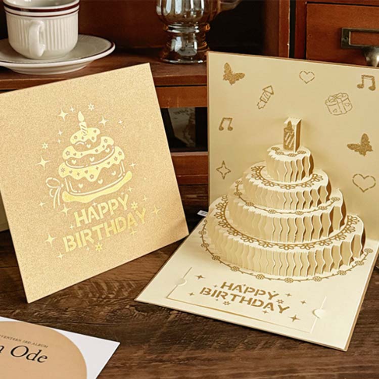 3D سالگرہ کے کارڈ کا سرورق رنگ کے ایمبوسنگ عمل کے ساتھ بنایا گیا ہے۔ اس کے داخلہ میں 4 پرت والے کیک کا ڈیزائن پیش کیا گیا ہے ، اور مبارکبادی پیغام کے لئے ایک چھوٹا سا گریٹنگ کارڈ شامل کیا گیا ہے۔